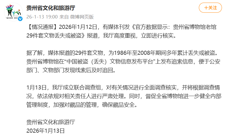 贵州省文化和旅游厅1月13日发布情况通报:2026年1月12日,有媒体刊发《官方数据显示:贵州省博物馆老馆29件套文物丢失或被盗》报道,我厅高度重视,立即进行核实。据了解,媒体报道的29件套文物,为1986年至2008年期间多年累计丢失或被盗。贵州省博物馆在“中国被盗(丢失)文物信息发布平台”上发布追索信息,便于公安部门、文物部门发现线索后及时追回。1月13日,我厅成立联合调查组,对有关情况进行全面调查核实,并将根据调查情况,依法依规对相关责任人进行严肃处理。同时,督促全省博物馆进一步健全内部管理制度,加强对藏品的管理,确保藏品安全。