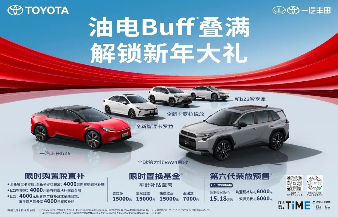 值得一提的是,2026年1月1日-1月9日,一汽丰田再推“解锁新年大礼”,回馈新老用户长久厚爱。